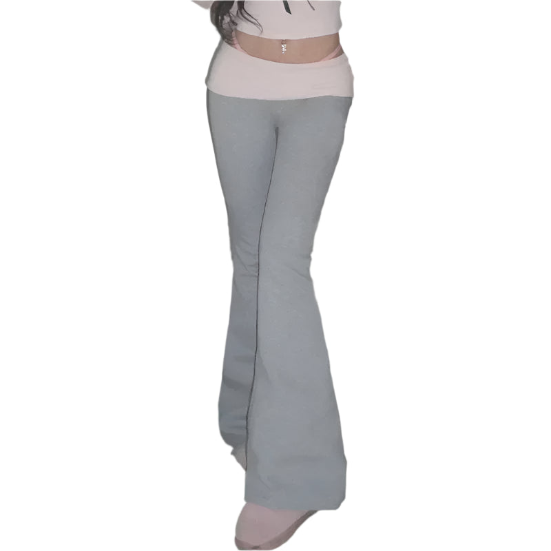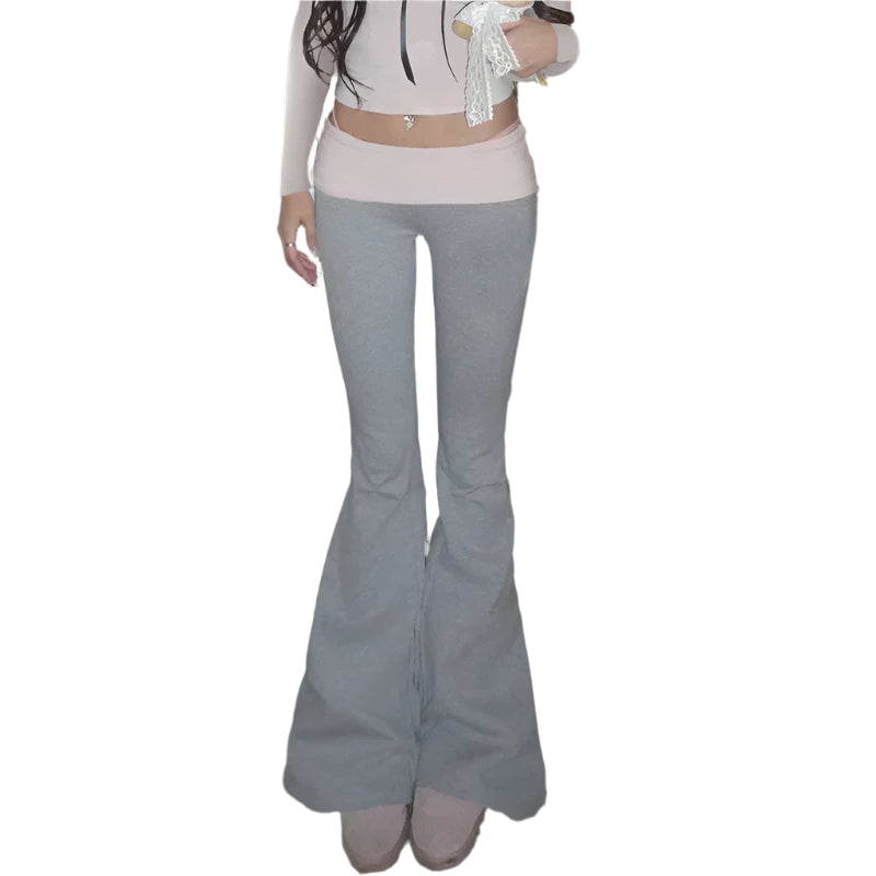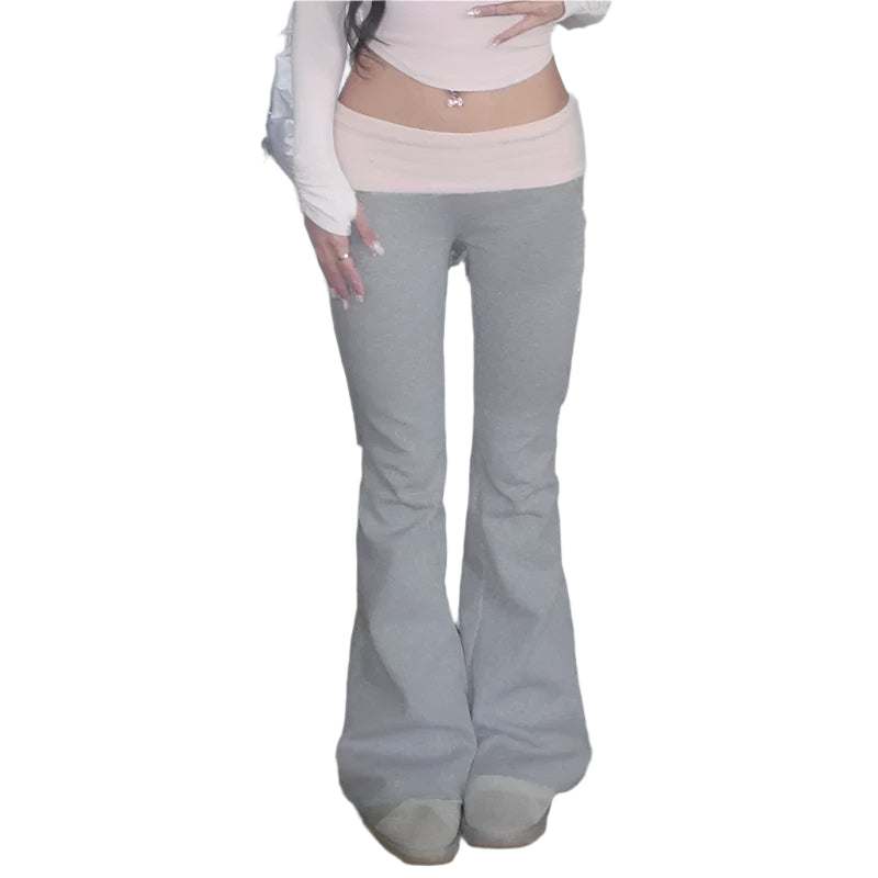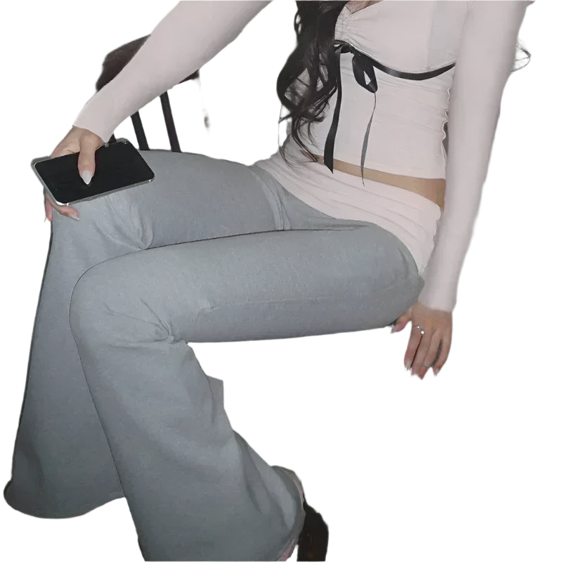 מכנסי פלאר אפורים עם דיטיילים בולטים בעיצוב פאטצ'ים – שילוב של סטייל ייחודי ונוחות.