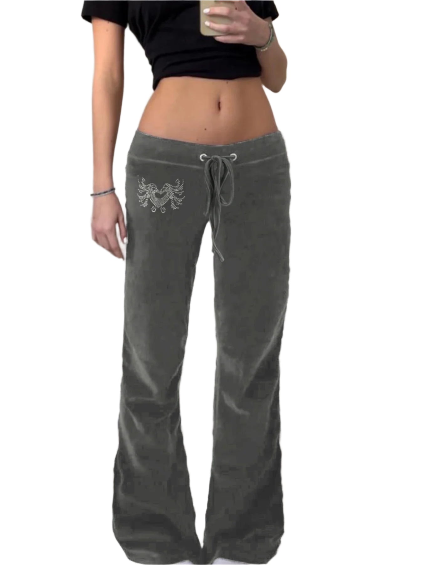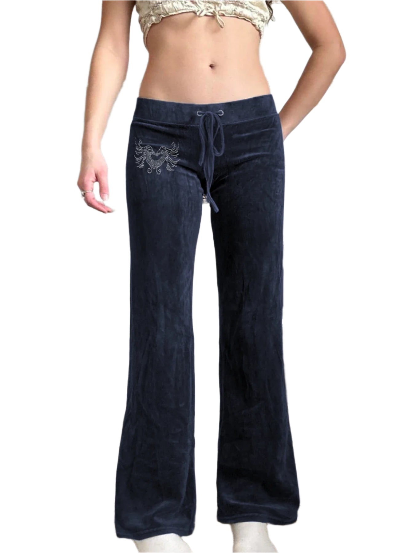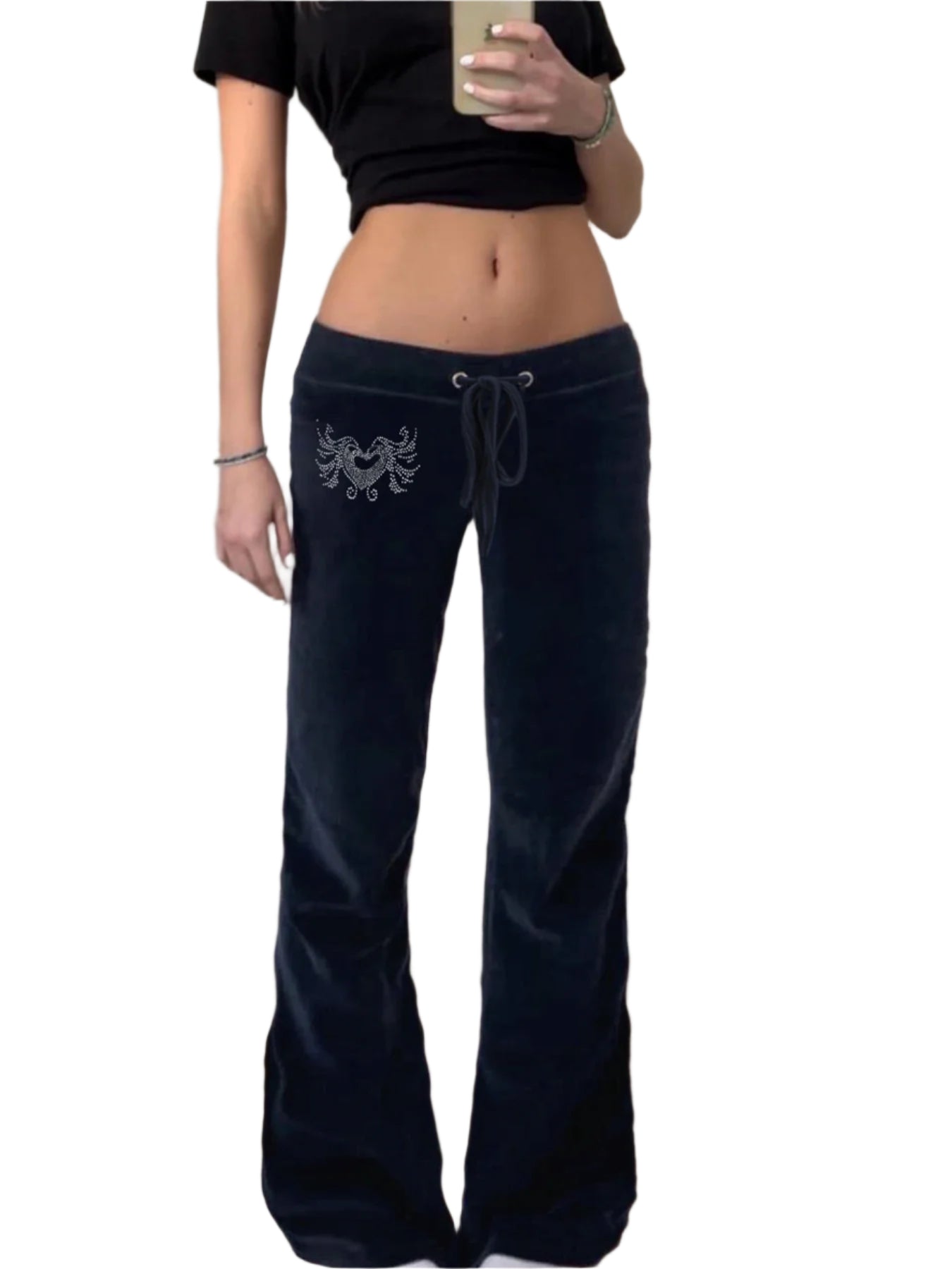 מכנסיים מתרחבים רטרו Y2K עם אבני חן וקשירה
